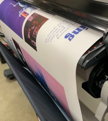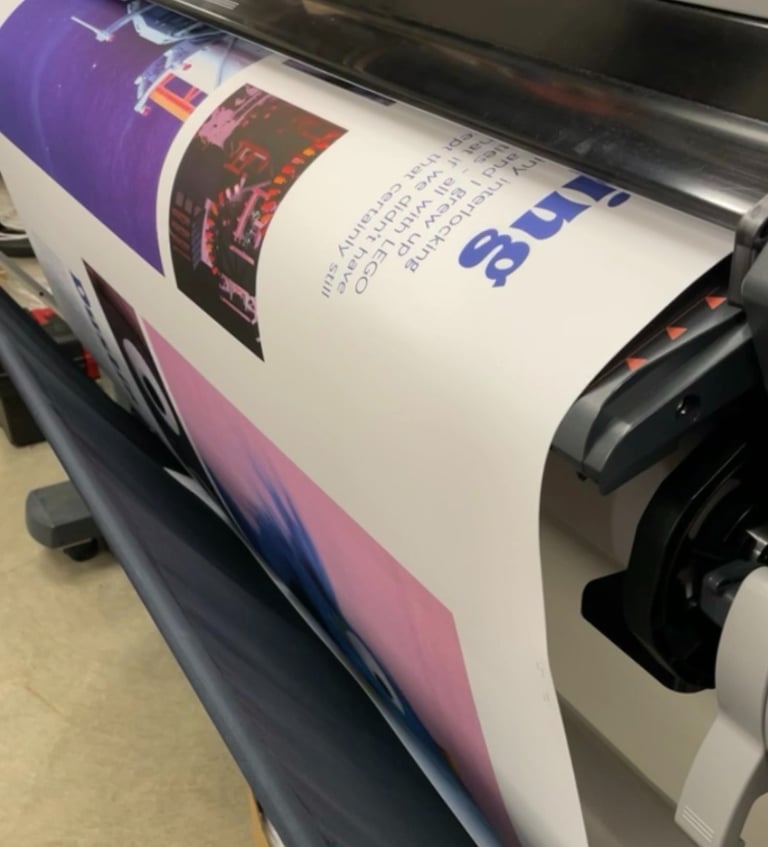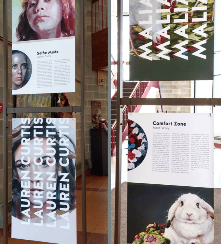 The gallery signage involved me learning how to use the large format printer on campus, navigating large rolls of adhesive paper, and aiding the department head in transferring the designs to wooden panels that were then suspended on a movable steel frame. It was awesome.