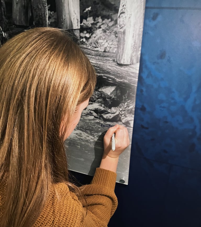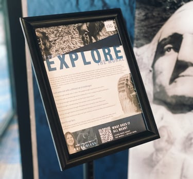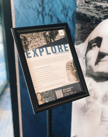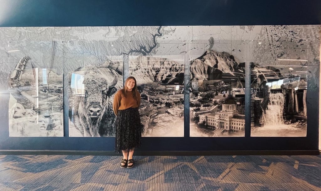 The back wall was wrapped with a map of South Dakota's terrain. From the wall, five transparent acrylic panels stand out as the real heart of the mural. When viewed individually, each panel captures a blend of the values listed above. Yet when you step back, the panels come together to showcase the one cohesive design with flowing landmarks such as the Black Hills or Falls park.